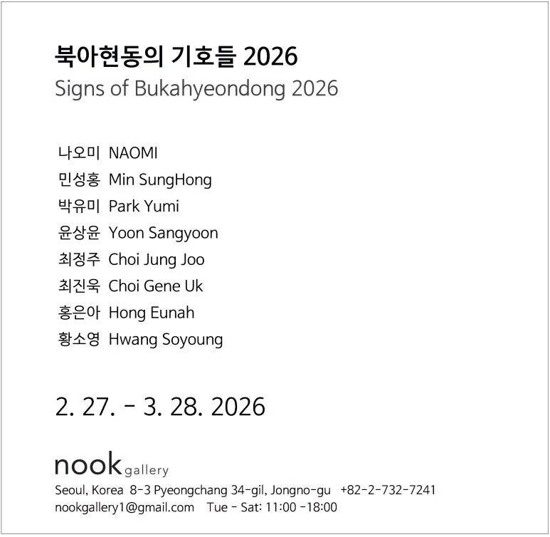 누크갤러리는 2026년 2월 27일부터 3월 28일까지 《북아현동의 기호들 2026》을 개최한다. 본 전시는 누크갤러리에서 매년 첫 전시로 이어져 온 스승과 제자들의 전시로, 2026년 제10회를 맞이한다. 이번 전시에는 최진욱 작가와 그의 가르침을 받은 7명의 작가가 참여한다. 이들은 단순한 사제 관계를 넘어, 각자의 확고한 작가 정신을 바탕으로 독립적인 예술 세계를 구축해왔다. “예술가들은 세계적으로 통합된 예술세계에 갇혀 있다”는 문제의식에서 출발한 《북아현동의 기호들》은 작은 물결처럼 번져가며 동시대 예술의 구조에 미세한 균열을 만들어 낼 것이다. 참여 작가: 나오미, 민성홍, 박유미, 윤상윤, 최정주, 최진욱, 홍은아, 황소영 출처: 누크갤러리