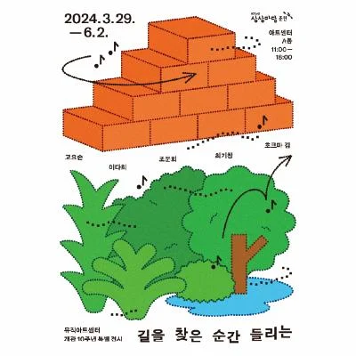 《길을 찾은 순간 들리는》 은 KT&G 상상마당 춘천 개관 10주년을 맞이하여 개최되는 특별 전시입니다. 아트센터 A동에서 펼쳐지는 이번 전시는 2014년 개관 이후 뮤직아트센터로서의 정체성을 만들어 온 행보에서 중심이 되었던 음악이라는 존재를 다섯 명의 작가와 함께 숨바꼭질에 연결 지어 되짚어봅니다.