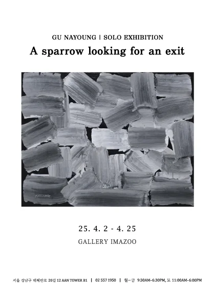전시 개요 OVERVIEW 오는 4월 3일부터 25일까지 갤러리 이마주에서 구나영 작가의 개인전 <A Sparrow Looking for an Exit>(출구를 찾는 참새)이 열린다. 구나영 작가는 자연의 형상에서 영감을 받아 나무와 숲을 상징적인 패턴으로 표현하며, 공존과 조화의 의미를 탐구한다. 한 그루의 나무는 개별적 존재를, 나무들이 이루는 숲은 함께 살아가는 공동체를 상징하며, 이러한 요소들은 그의 작업에서 반복적으로 등장한다. 그의 작품은 오랜 시간에 걸쳐 점점 단순화되는 과정을 거치며, 나무의 구체적인 형상보다 감정의 본질과 추상적 표현에 집중하게 되었다. 작가는 패턴을 쌓고 겹쳐 차분하고 고요한 분위기를 만들어내면서도, 부유하는 듯한 구성을 통해 생동감을 더한다. 그의 작업은 보고, 듣고, 느낀 개인적인 삶의 순간들을 기록하듯 완성되며, 마치 한 편의 시를 쓰거나 음악을 작곡하듯 세심한 관찰과 변주, 절제를 통해 형태를 만들어간다.이처럼 감각의 기억과 내면의 이야기를 담은 작품들은 관람자에게 다양한 연상과 해석의 가능성을 열어두며, 잠시나마 작은 공감과 치유의 시간을 제공하기를 희망한다. 작가는 자신의 진심 어린 작업이 자신을 치유했던 것처럼, 관람자들에게도 짧은 산책과 같은 휴식과 위로를 건네기를 바란다.