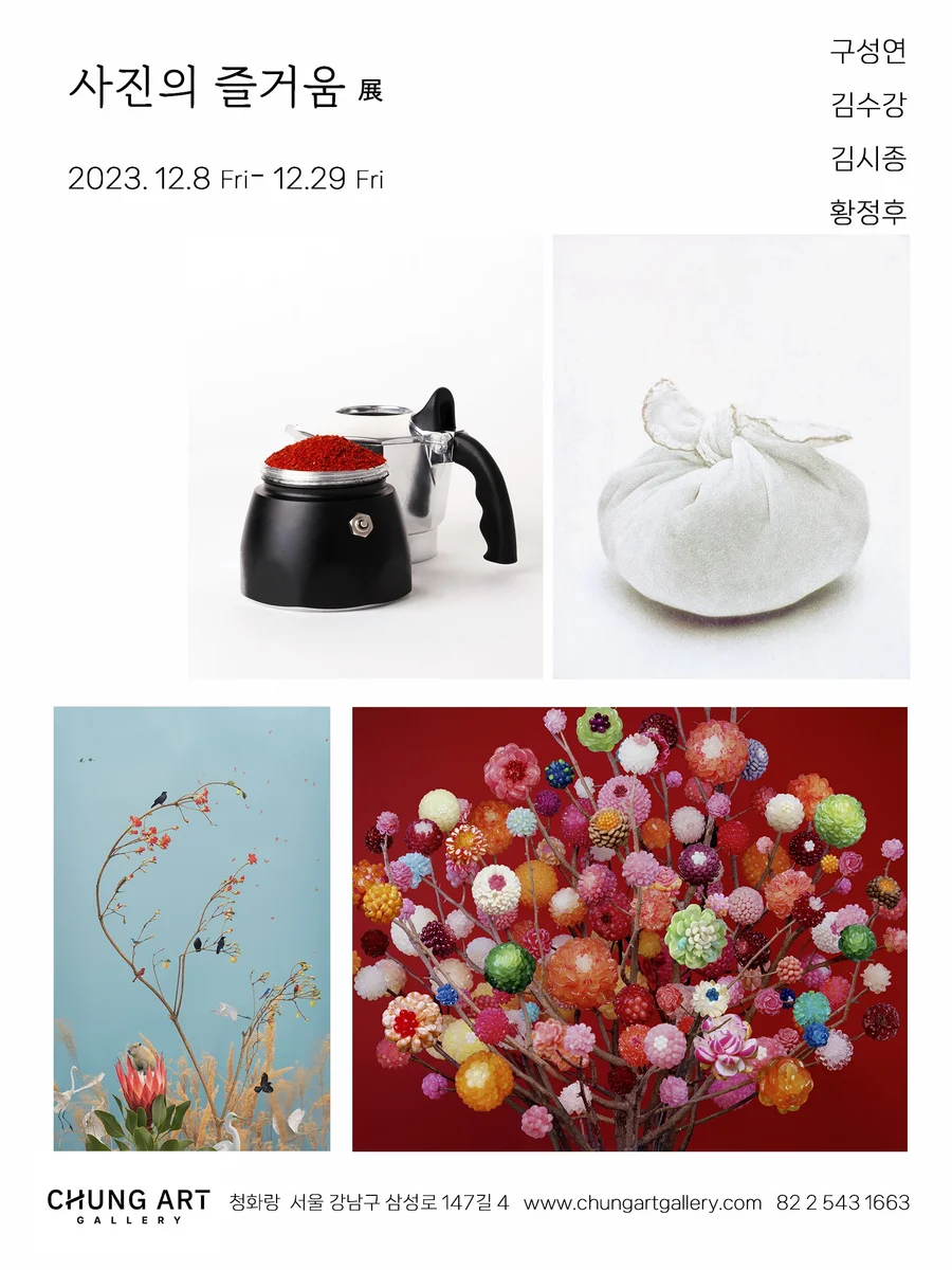 전시 개요 OVERVIEW 청화랑은 12.8-12.29까지 <사진의 즐거움> 展을 개최합니다. 전시에 참여하는 4인의 작가는 구성연, 김수강, 김시종, 황정후로, 각자 본인만의 색깔이 분명하며 사진 분야에서 인정받는 유명작가들입니다. 사진은 가장 아름다운 순간의 포착이며 인내의 결과이자 일상의 기발함이 담겨있어 회화와는 또다른 매력을 선사합니다. 청화랑은 아트에디션 및 아트 페어때마다 사진작품을 꾸준히 전시해왔으며 사진이 주는 즐거움을 많은 분들이 공감해주시길 바라는 마음으로 이번 연말 전시를 기획하였습니다. 구성연 작가(1970) 가 선보이는 <사탕>시리즈는 세속적 소망을 담은 화사한 꽃그림인 우리 민화 모란도에서 모티브를 얻어 만들게 되었습니다. 달콤하지만 끈적하고 이내 녹아서 없어지는 사탕의 속성을 그림 속 모란처럼 만들어 보인 작업입니다. 동국대학교 인도철학과와 서울예전 사진과를 졸업했으며 현재 서울에서 활동중입니다. 서울시립미술관, 경기도미술관, 대구미술관을 비롯하여 국립현대미술관 미술은행에 다수의 작품이 소장되었습니다. 김수강 작가(1970)는 서울대 서양화과 졸업후 뉴욕 프랫 인스티튜트에서 사진학을 전공하였습니다. 미술에 대한 관심과 사물에 대한 애정이 남다른 김수강 작가는 19세기 인화 기법의 하나인 검프린트 기법으로 작업을 하는데 촬영한 사진을 프린트한 후 감광액과 인화지를 직접 만들고, 여러 차례 색을 입히고 덜어내고 건조하는 과정을 반복하면서 작업합니다. 사진과 판화, 회화의 속성을 고루 갖추고 있어 회화같은 사진을 선보입니다. 이번 단체전에는 따뜻한 느낌을 주면서 담백하게 표현한 한국적인 보자기 작품을 전시합니다. 김시종 작가(1983)는 연세대 언론영상학부 전공 이후 미술에 대한 관심으로 영국 왕립 예술학교를 졸업하였고 자유롭게 미술을 즐기는 작가입니다. 민화라는 한국적인 주제로 시작하여 본인만의 기법과 색깔을 나타내고 있으며 언제나 그렇듯 재치있고 유쾌한 사진 작품을 선보입니다. 작품속 작은 생명체 하나하나 꼼꼼히 봐야할 섬세한 작업들입니다. 황정후 작가(1973)는 프랑스 유학 후, 존재하는 모든 것의 본질에 대해 탐구하는 작업을 이어가고 있으며, 모든 것들과 진실한 대화를 나누고 싶었던 작가가 현대인들의 이중성에 대해 꼬집고, 피식 웃게 만드는 작업을 하고 있습니다. 이번 전시에서는 과일 시리즈 이후의 새로운 정물 시리즈를 소개합니다.