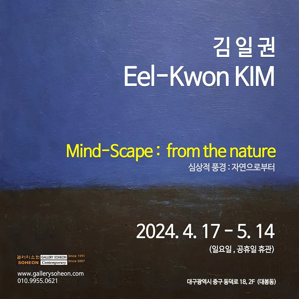 전시 개요 OVERVIEW 김일권 Mind-Scape : from the nature Mind-Scape : from the nature 심상적 풍경 : 자연으로부터 김일권 Eel-Kwon KIM 갤러리소헌&소헌컨템포러리 053-426-0621 / 대구광역시 중구 동덕로18, 2층 4. 17(수) – 5. 14(화) *토요일 사전예약, 일요일, 공휴일 휴관 김일권의 작품을 보고, 그 의미를 파악하려면, 풍경화에 대한 통상적인 관념과 이해를 넘어서야 한다. 김일권의 풍경화는 추상화와 바로 연결이 되기 때문이다. 그의 풍경화는 구상과 추상 사이의 연결점이며, 지렛대이고, 저울의 균형대이며, 미래를 투시하는 방법이기도 하다. “고요한 땅”이라는 그의 연작은 일종의 예언적인 지진계이며, 의도적인 계산을 배제한 경고이며, 자신에 대한 사고와 감정을 보여주는 방법이다. 김일권은 풍경을 보는 행위가 내재적인 형이상학적 행위이며, 자연의 실재와 화해를 하는 길이며, 수평선의 무한을 느끼고, 자아의 고요, 고독, 공포와 탐욕으로 갈라 진 세상 속에서 영적 존재의 무한한 장려함과 화해하는 길임을 이해하고 있다. 그의 그림은 과거와의 관련성 속에서 미래를 상상하는 방식이다. 다시 말하면, 그것은 동양 풍경화의 전통인 간명한 고요함, 모호함이 없는 의미, 담대한 이해력과 사유의 감정을 보여주고 있다. 여기에서 우리는 인간적 정서의 우주를 발견할 수도 있고, 시간과 공간을 넘나들 때 우리의 감정을 지배하는 은하수의 분위기를 발견할 수도 있다. .. 이 작품엔 어둠과 빛이 지나가고 있다. 장엄한 정적, 깨어남, 순간에서 순간으로의 전환이 있다. 김일권의 풍경화는 시간성을 초월하고 환영과 같은 느낌을 주지만, 날짜를 제목에 명시하고 있다는 점에서 시간이라는 요소가 김일권의 풍경화에서 매우 중요한 기능을 하고 있음을 알 수 있다. 작가에게 그 특정한 날짜는 그 풍경이 숭고해지도록 맞춰진 가상의 시간에 대한 기록으로서, 작가 자신의 요구에 맞춰 연장된 시간에 대한 기록이라고 할 수 있다. 재현적인 풍경화가 특정장소와 계층 혹은 사회적으로 관련있는 내용을 강력하게 시사하는 도구라면, 김일권의 연상적인 풍경은 그 안에서 희망을 꿈꿀 수 있는 장소, 현실의 지역과 도시에 대한 대안적인 공간, 또 무엇이든 가능한 공간이다. [평론] 김일권의 새로운 풍경화 , 로버트 C. 모건 Robert C. Morgan art critic may 2005 NY ARTS 중에서 김일권 작가가 한 점의 작품을 완성하기까지는 적어도 한 달에서 때로는 몇 년이 걸리기도 한다. 작품을 자세히 들여다보면 겹겹이 쌓아올린 색의 층이 그 이유가 된다. 단순하게 면이 분할된 것이 아니라 칠을 올리고 나서 작가 스스로 만족할 때까지 여러 색깔을 덧 올려 깊이를 만들어낸다. 예를 들면 오묘한 빨간색 너울거리는 속에 노란빛이 섞여있고, 그 빛의 바탕에는 검정이 자리하면서도 보랏빛이 돈다. 덧 올린 층 사이로 마티에르가 불규칙하게 보이기도하고 반짝이는 펄이 보일 때도 있다. 작가가 덧 올린 세월이 작품 속에 고스란히 나타난다. Kim Eelkwon is a Korean Asian Modern & Contemporary painter who was born in 1962. Kim Eelkwon received his BFA from Chosun University, Gwangju, Korea and his MFA from the New York Academy of Art. He had one-person exhibitions at the Posco Art Museum, Seoul, in 2007; the Andre Zarre Gallery, New York, in 2005; the Mediapia Gallery, Baltimore, in 2005; and the Ye Mack Gallery, Seoul, in 1994, 1995, 2000 and 2003. Kim’s work is in the collection of the National Museum of Contempor