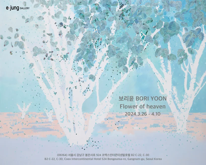 전시 개요 OVERVIEW 보리윤, flower of heaven-24-1, 162.2×130.3cm, cut magazine pieces on canvas, 2024 이번 이정 갤러리 전시<Flower of heaven>에서 선보일 이미지는 특정 대상에 대한 이미지가 아니라 마치 어떤 풍경의 일부처럼 보이고 있으며, 일종의 이미지적 서사를 읽어낼 수 있을 정도의 내용이 담긴 구성적 화면이다. 이는 작가가 의도적으로 텍스트가 해체된 지점에서 특정 사물들의 관계가 이미지 형태로 드러나 보이도록 캔버스 위 표면적 요소들을 재구축한 것이다. 작가는 우리가 미처 인지하지 못한 풍경 속의 긴장 관계를 형성하여, 마치 유토피아와도 같은 환상적인 순간과 시각적 경험을 감상자에게 제시한다. 보리 윤의 작업방식은 작업의 주제가 정해지면, 주제와 관련된 기사들을 잡지 속에서 긁어모은다. 주제는 작가의 관심이나 의지에 따라 정해지는데 보통 미장원에서 볼 수 있는 잡지들 속에서 작업에 끌어들일 기사들을 모으고, 읽고 자른다. 5mm 내외의 좁은 종이 띠가 되어 화면에 꼴라주 되고, 의미망은 해체되어 물질이 된 파쇄 종이 띠는 미리 준비된 드로잉에 따라 화면 위에 가지런히 놓여 새로운 풍경이나 정물이 된다. 이 같은 작업방식 및 사유 방식은 물리적으로 잘려져 의미를 상실하게 된 텍스트들과 작가의 상상력 사이의 상호작용을 일으켜 또 다른 새로운 이미지를 생성해낸다. 보리윤, A plant-1, 112.1×162.2cm, cut magazine pieces on canvas, 2019