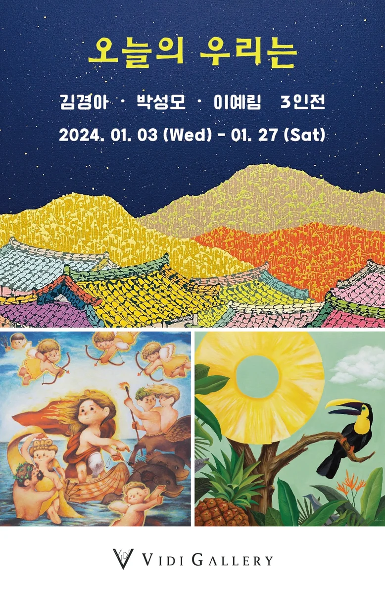 전시 개요 OVERVIEW 비디갤러리에서는 01월 03일부터 01월 27일까지 김경아, 박성모, 이예림 작가의 3인 기획 초대전인 <오늘의 우리는>을 진행한다. 김경아 작가는 우리가 삶을 살아가며 만나게 되는 다양한 사람들과 그 안에서 맺게 되는 여러 관계성, 그리고 서로 주고받는 영향력에 주목한다. 자신과 닮아서, 때론 달라서 마음이 잘 통하는 사람들도 있겠지만 그렇지 못한 관계들이 더 많을 것이다. 모든 관계가 좋을 순 없겠지만 마음을 열어 주변을 다시 한 번 새로운 시선으로 바라보기 시작한 작가는 살아가면서 만나게 되는 사람들의 긍정적인 면들을 관찰하면서 좋아하는 나무와 동물들로 비유하고 그 관계 안에서의 사랑을 캔버스에 담아내고 있다. 다양한 이야기들을 통해 서로 마음을 주고받으며, 사랑이라는 감정은 생각보다 쉽고 흔하다는 것을 형형색색으로 묘사해낸다. 닮음과 다름 속의 우리지만 서로에게 힘이 되어줄 수 있는 것은 결국 사랑이기에, “난 어떤 관계 속에서 살아가고 있을까?”라는 질문을 끊임없이 던지며 도출되는 따스한 메시지들을 우리에게 전달한다. 박성모 작가는 관습, 선입견, 편견, 고정관념과 같은 시각의 틀에서 벗어나 어린아이와도 같이 자유로운 행위로 작품을 표현한다. 꾸밈없는 순수한 시각으로 세상을 바라보았던 그때의 가장 좋았던 추억을 떠올려보면 그리 특별하지는 않지만, 바로 가족과 함께였던 일상의 순간일 것이다. 우리는 각자의 위치에서 지켜야 할 것들을 지키며 바쁘게 살아가느라 일상의 작은 행복들을 놓치고 살아가며, 또한 당연하지 않은 것들이 당연한 것으로 여겨져 소중함을 잊고 살아간다. 가족, 친구, 연인과 함께 보내던 작은 일상들이 가장 특별하고 소중한 추억이 됨을 깨닫게 된 작가는 소소한 일상 속 곁에 있는 소중한 가족을 중심으로, 그 안에서 느끼는 행복을 자신만의 조형언어로 표현한다. 누구에게나 동심은 아직 남아 있기에 작품을 통하여 순수하고 따뜻한 마음을 다시금 느끼고, 잃어버렸던 소중함을 되찾을 수 있을 것이다. 또한 반복되는 일상 속에서 잠시 벗어나 주변을 둘러보며, 소중한 사람들과 함께하는 작은 행복을 경험하기를 소망한다고 작가는 이야기한다. 이예림 작가의 작업은 홀로 떠난 낯선 도시인 뉴욕의 거리를 거닐다 마주친 건물의 스케치로부터 시작되었다. 그 이후 작가는 상하이나 방콕 등 다양한 도시에서 거주하게 되며, 그저 소요자처럼 도시를 거닐고 바라보며 지냈다. 사람들은 도시를 만들었고 필요에 의해 건물을 올렸지만 정작 사람들이 밀물처럼 밀려왔다가 썰물처럼 빠져나가는 도시를 지키는 것은 언제나 그 자리에서 사람들을 내려다보는 건물이었다. 그들은 도시의 얼굴이었고 매일 작가에게 다른 이야기를 들려주었다. 무엇보다 견고하게 만들어졌고, 또 그래야만 하는 도시의 건물들. 이는 복잡한 내면을 숨긴 채, 아무렇지 않은 얼굴로 하루 하루를 살아가는 사람들의 일상과도 닮아 있다. 견고하지만 부드러운, 직선적이지만 유기적인 선으로 얽힌 작가의 작품 속 건물들은 도시에서 살아가는 사람들의 감정을 담는다. 즉, 작가는 살아가면서 분명 느끼지만 그 실체를 정확히 표현하지 못하거나 그럴 필요나 여유를 가지지 못하고 그저 쌓여가는 어떤 감정의 떨림을 포착하여 감상자에게 전달하고 있다.