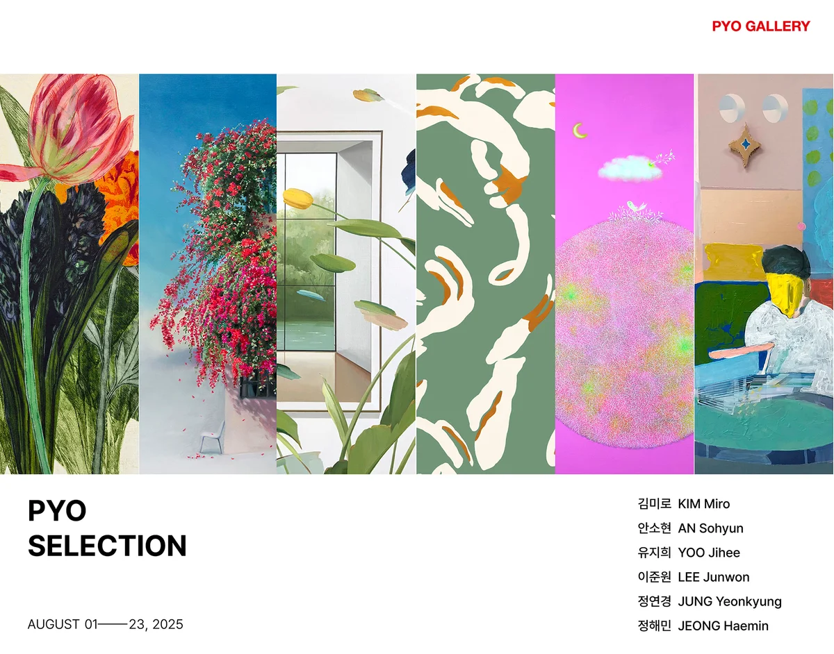 전시 개요 OVERVIEW 표갤러리는 2025년 8월 1일 – 8월 23일 전을 개최한다. 김미로, 안소현, 유지희, 이준원, 정연경, 정해민은 각기 다른 매체와 고유의 조형 언어를 바탕으로 지금 이 시대의 예술적 질문을 던진다. 본 전시는 다섯 작가가 각자의 서사로부터 출발해 하나의 공간에서 교차하는 지점을 포착하며 감정과 사유, 기억과 환상, 현실과 가상이 중첩되는 감각의 지형을 펼쳐 보인다. 김미로는 판화와 콜라주를 기반으로 자연의 형상과 한국적 정서를 재해석하며 정제된 조형성과 서정적 리듬을 동시에 드러낸다. 안소현은 일상의 풍경을 따뜻하고 몽환적인 시선으로 재구성하며 익숙한 장면에 스며든 환상적 감수성을 끌어올린다. 유지희 작가의 반추상 프레임 회화는 자연에 대한 기억을 바탕으로 다양한 장소와 시간을 화면위에 재구성한 사색의 풍경을 선사한다. 이준원은 즉흥적인 붓질과 자유로운 형상을 통해 인간과 신화의 원형적 에너지를 탐구하고 정연경은 자연철학적 사유를 바탕으로 생성과 소멸, 시간의 미묘한 결을 섬세하게 포착한다. 정해민은 디지털 이미지와 수작업을 결합하여 가상과 현실의 경계를 유연하게 넘나들며 시각적 감각의 확장을 시도한다. 각기 다른 세계관과 조형 방식을 지닌 이들의 작업은 전시 공간 안에서 교차하고 공명하며 다층적인 미적 경험을 생성한다. 은 작가들이 축적해온 예술적 여정의 한 단면이자 동시대 미술의 스펙트럼이 입체적으로 드러나는 장면이다. 관객은 이들이 제시하는 상이한 시선과 언어를 따라 경계 너머로 확장되는 오늘의 예술을 마주하게 될 것이다.