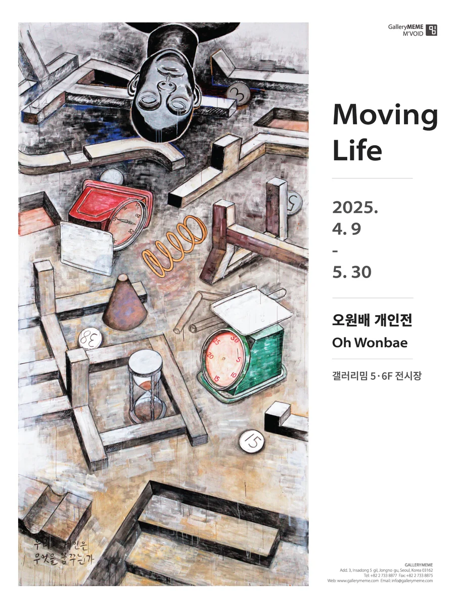 전시 개요 OVERVIEW 불확실한 세계와 불완전한 세계 고용수(미술이론가) 오원배의 개인전 《Moving Life》는 격변의 시대와 죽은 생명(Still Life)이 아닌 움직이는 생명, 살아있는 것과 같은 정물화를 중의적으로 표현한다. 이 중의성은 두 가지의 작품에서 찾아볼 수 있는데, 대형 회화와 거울지에 그려진 꽃 정물화가 그것이다. 필자는 격변의 시대를 반영하고 있는 대형 회화와 꽃을 실재하는 것처럼 그린 회화를 각각 불확실한 세계와 불완전한 세계로 명명하고 분석할 것이다. 먼저 불확실한 세계로서 <무제>이다. 세로로 긴 대형 회화의 상단에는 인물의 흉상이 거꾸로 그려져 있고 그 아래로 구조물과 숫자가 있는 공, 저울 등이 어지럽게 놓여 있는 모습이다. 가운데 위 인물에서 왼쪽에 쓰러진 붉은 저울을 지나 그림의 하단으로 내려오면 모래시계와 침 없는 초록색 저울로 이어지고 계단과 같은 공간을 통해 시선은 밖으로 나간다. 구조물의 형태들은 관람자의 시선을 연결하는 장치로 작동한다. 전체적으로 무채색의 안료로 그려진 화면 속에 붉은색의 쓰러진 저울이나 바로 서 있지만 침이 없는 초록색 고장 난 저울에 시선이 고정되는데, 사물이 지닌 재현적 이미지가 강하게 와 닿기 때문이다. 작가는 2023년 6월 어느 날 목포로 떠난 여행에서 구도심 한 곳에 있던 중고품 판매상에 쌓인 낡고 고장 난 저울을 우연히 접한 뒤 작품의 소재로 활용하겠다는 생각이 들었다고 한다. 2023년 인천아트플랫폼 개인전의 대형 회화에 그려진 침이 있는 저울, 2024년 아트사이드 개인전에서 공간 내에 설치작품으로 선보였던 실제 저울은 이번 작품에서 이미지로 다시 등장하였다. 도시와 삶을 늘 관찰해 왔던 작가가 발견한 오브제는 우연을 넘어 사물에서 이미지로, 의미를 부여받은 사물에서 서사적 상징으로 재구성된 셈이다. 고장 난 저울이 놓인 작위적인 상황은 무엇을 이야기하려는 것일까? 고장 난 저울은 제 기능을 상실한 현시대의 단면을 상징한다. 국내 현실을 넘어 세계에서 발생하고 있는 지정학적 갈등이나 기후 문제 등 그 이상의 광의적 맥락에서 인류적 관점으로 볼 것을 제안한다. 화면 중간에 배치된 공의 숫자는 규칙보다는 시간 게임과 같은 불확실성을, 모래시계는 흘러가고 있는 현재의 시간성과 함께 해석하도록 한다. 여러 가지의 이질적인 사물의 병치로 낯섦을 유도하기보다 하나의 서사로 작동하는데, 그 이유는 그가 과거부터 줄곧 미묘한 사회문제에 대한 이슈를 표현해왔던 점이다. 작품의 연속성과 관련하여 보았을 때도 2023년 작품에서 저울을 든 정의의 여신상 이미지와 기중기 이미지가 도시개발 풍경과 함께 등장했던 점을 미루어보면 저울이 갖는 알레고리적 어법을 간과할 수 없다. 그러나 사회를 비판적으로 바라보면서도 현실의 정치에 예술로 직접 발언하기보다 거리를 두는 그의 태도를 밑바탕에 깔고 이해할 필요가 있다. 이번 전시에 등장한 저울은 앉은뱅이저울로 용수철에 힘이 가해졌을 때, 일정한 비율로 줄어드는 원리를 이용한 것이다. 대체로 시장이나 식품점에서 매매할 때 사용하는 것으로 전자식 저울 못지않게 많이 보이는 사물이다. 저울의 숫자는 사회적으로 합의된 제도, 규율로 읽히고 계량의 행위는 우리의 삶을 정해진 기준에 맞춰 측정하는 것으로 읽힌다. 그가 그린 저울의 숫자는 제거되어 있고 용수철은 이탈되어 있으며 선명하게 빛나는 안료로 그려진 공과 숫자는 강조되어 있다. 이는 세계 내에 존재하는 사회적 제도와 장치가 제 기능을 발휘하지 못하고 불확실한 세계에 지배되어 있음을 의미한다. 인간은 본래 사회 내에 순응하며 살아가야 할 운명으로 태어나지만 정의와 평등과 같은 가치를 위해, 제 기능을 찾기 위해 저항해 오기도 했다. 이 작품에 저항하는 인간의 형상은 없고 작위적 상황이 주는 상징적 분위기만 느낄 수 있는데, 그것은 불확실한 세계에 종속된 보편적 인간의 혼란스러움, 불안감이다. 막연히 예측 불가능한 것과 다른 정상적이었던 것이 작동하지 못할 때의 불확실함은 회복의 가능성도 내포한다. 그가 줄곧 표현해 왔던 뒤틀린 자세로 고통 받는 듯한 인간