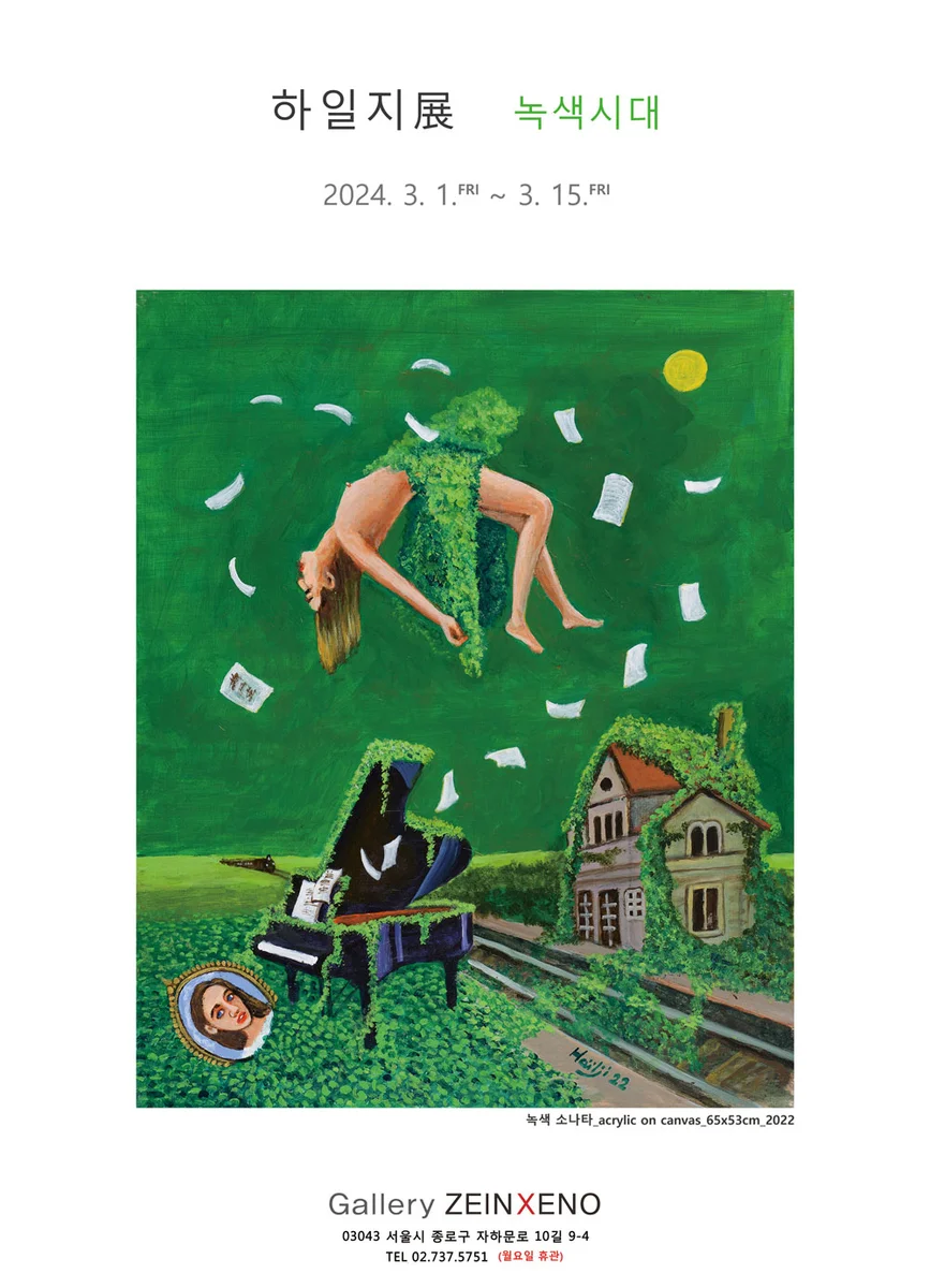 전시 개요 OVERVIEW 90년대 ‘경마장 가는 길’로 한국 문단에 포스트모더니즘 붐을 일으켰던 소설가 하일지는 2018년부터 그림을 그리기 시작했고 갤러리 자인제노와는 이번이 3번째 기획전이다. “사람들은 나에게 왜 녹색으로 그림을 그리느냐고 묻곤 했다. 나는 일일이 대답하기가 거북해서, 사다 놓은 녹색 물감 두 통이 남아 있었는데 그걸 처리하려고 라고 대답하곤 했다.” 하일지의 이 대답은 어느 정도 사실이다. 그의 작업실에는 그다지 사용하지 않는 녹색 물감 두 통이 뒹굴고 있었으니까 말이다. 그러나 그런 표면적 이유보다 하일지는 녹색은 사용하기에 따라 깊이와 신비가 있다는 것을 발견했다는 점이 녹색을 쓰게 된 이유로 더 정확하다. 피카소의 청색과는 달리 다양하고 독특한 정서를 표현하는 데 녹색은 나쁘지 않다는 생각을 하게된 그는 한동안 녹색에 천착하게 되었는데, 그 과정은 마치 독특한 음색을 가진 새로운 악기를 다루는 것과 같다고 말한다. 한편 무서운 성장력을 보이는 넝쿨식물을 그리면 독특한 그림이 되겠다는 발상은 무려 30년 전부터 하고 있었다는 그는 당시에는 화가가 아니고, 화가가 될 생각도 없었기 때문에 만나는 화가들을 붙들고 아이디어를 들려주고 그걸 그려보라고 권유하기도 했다고 한다. 그의 이야기를 흥미롭게 듣긴 하지만 그걸 실제로 그리는 화가는 아무도 없었고 세월이 한참 흐른 훗날 화가가 된 하일지는 30년 전 자신의 발상을 그림으로 그려보기로 한 것이다. 기량이 모자라서 생각했던 것만큼 그림이 그려지지 않았고 자신의 붓은 뜻대로 움직여지지 않았다는 그는 “정말이지 나는 재주가 없다는 것을 새삼 느끼게 된다”고 말한다. 하일지는 소설을 쓸 때도 그랬지만, 그림을 그릴 때도 잘 그리기 위해서 그리지 않는다. 그는 세상에는 잘 그리는 작가는 부지기수로 많은데, 나까지 굳이 잘 그릴 필요를 느끼지 않는다고 강조한다. “자신이 아니면 그렇게 그릴 수 없을 대상, 이를 잘 그리려는 유혹에서 벗어나 자기만의 화법으로 전시를 준비했다. 이런 작가의 태도는 그의 작품 ‘경마장 가는 길‘을 연상시킨다. “나는 아직 한 번도 경마장에 가본 적이 없다. 따라서 나는 경마장이 어디에 있는지 알지 못한다. 오래전에 언젠가 한 번은 누가 나에게 경마장에 대해서 이야기 해 준 적이 있다. 나는 그에게서 들은 이야기를 다만 기억하고 있을 뿐이다. 그러나 나는 그가 누구였는지 지금은 알 수 없다.” 작가는 미술을 알지 못한다 말했지만, 그는 지난 몇 년간 누군가로부터 전해 들은 이야기들을 기억하며 내면의 소리로 직조한 그림과 함께 부유하며 작업을 이어가고 있다.