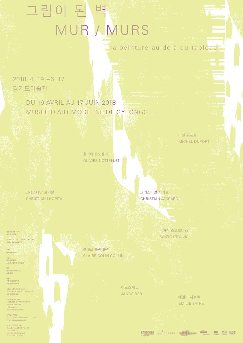 프랑스 벽화전 《그림이 된 벽 MUR/MURS, la peinture au-dela du tableau》 2018. 04. 19. ~ 2018. 06. 17. 경기도미술관 기획전시실 경기도미술관은 2018년 첫 기획 전시로 프랑스 벽화 전시 《그림이 된 벽 MUR / MURS, la peinture au-delà du tableau》을 개최합니다. 프랑스 현대미술가 8인이 전시장에서 직접 제작한 벽화를 선보이는 《그림이 된 벽》전은 프랑스 현대회화의 다양한 면모를 보여주는 전시입니다. 작품의 배경으로만 존재하던 전시장의 벽들은 참여 작가들의 각기 다른 회화적 실천을 통해 작품의 중요한 요소가 됩니다. 1960년대 후반과 1970년대 초 프랑스에는 회화를 해체함으로써 이에 대해 근본적으로 탐구하고자 했던 쉬포르 쉬르파스(Supports/Surfaces)*라는 예술운동이 있었는데, 이번 전시의 참여 작가들은 회화란 무엇인가에 대하여 캔버스의 안팎으로 근원적이고 창조적인 성찰을 이어가고 있습니다. 회화에 대한 작가들의 실험은 프레임을 넘어서 벽과 공간으로 확장됩니다. 작가들은 건축적 규모의 회화나 드로잉으로써 추상에서 구상에 이르는 이미지의 세계를 창출하거나 그을음과 균열로써 벽면에 그림을 새깁니다. 벽이 그림이 되고 그림이 벽이 된 전시장에서는 작품들을 가까이 다가가서 볼 수 있으며, 시야의 범위를 넘어선 규모의 그림들 사이를 거닐면서 새로운 시지각적 경험을 할 수 있습니다. 회화의 기본 요소인 형과 색, 그리고 회화적 행위의 흔적을 벽화로써 극대화하여 보여주는 이 전시는 가상의 리얼리티와 각종 표상들, 범람하는 이미지로 가득한 요즘의 세계에서 이미지란 무엇인가에 대하여 본질적으로 사유해 볼 수 있는 기회를 제공합니다. * ‘MUR/MURS’는 ‘벽/벽들’이라는 의미를 지닌 프랑스어입니다. 주요작품 및 작가소개 에밀리 사트르, 느슨한, 2018, 벽에 페인트 ©2018IllésSarkantyu 에밀리 사트르(1979년생) 에밀리 사트르는 산책이라는 회화적 실천을 통해 벽화를 그린다. 색과 면으로 그려진 형상들이 작가의 움직임을 따라 선형적으로 이어진다. 작가의 벽화는 곧 작가가 지나간 흔적이다. 이어지고 겹쳐진 형상들은 외부의 대상을 묘사하기 위한 것이 아니라, 즉흥적이고 우연적인 방식으로 벽면들과 만나며 추상 패턴으로 구성된다. 드로잉의 구성요소들은 언뜻 기계적으로 반복되는 모양새 같아 보일 수도 있겠지만, 이들은 정밀하게 재단된 모습이라기보다는 작가의 손에 의해 일일이 그려진 형상들이다. 이는 유기적으로 이어진 흐름 안에서 작가가 수공예적으로 엮어간 흔적으로서, 작업 과정의 시간적 흐름을 담고 있다. 규칙이나 강령에 얽매이지 않고 수행적으로 이어간 드로잉의 행위와 여정, 그 순간 자체가 작품이 된다. 닫힌 결론을 보여주는 그림이 아니라 바람처럼 유영하는 드로잉은 색과 선, 덩어리에 유기체적인 생명력을 불어넣는다. 야노스 베르, 무제, 2012-2018, 캔버스 천에 아크릴 ©2018IllésSarkantyu 야노스 베르(1937년생) 야노스 베르는 이젤에 캔버스를 올리고 그림을 그리는 대신, 캔버스 천을 바닥에 깔고 그 위에 거대한 붓을 세워 든 채 선을 긋는다. 화폭 안으로 작가가 들어가서 사이사이 간격을 두고 선을 긋는 작업을 통해 리드미컬한 선이 그려진다. 작가는 구체적인 설명이나 인공적인 구성, 문학적인 수식들을 배제하고, 무의식적이고 우연적인 작업 행위로 자취를 남긴다. 신체적 행위가 반복적으로 이어지는 작업의 과정은 흡사 수행의 과정과도 닮아있다. 작가의 작업에서는 위계적인 논리가 없다. 선과 선 사이에 있는 하얀색은 그저 바탕이 되는 것만이 아니다. 채색된 선을 존재하게 하는 주요한 요소이자, 화면에서 선과 관계를 맺는 또 다른 형태의 선이 되는 것이다. 바탕에 선이 드러나는 것만이 아니라, 선들 사이에서 하얀 여백이 형상으로 나타나며, 채색된 선이 하얀 여백의 바탕이 되기도 한다. 이와 같이 색채들이 관계 맺는 방식은 동양적 사상을 연상시키기도 한다. 올리비에 노틀레, 딱딱한 벽, 즐거운 우리집(회화