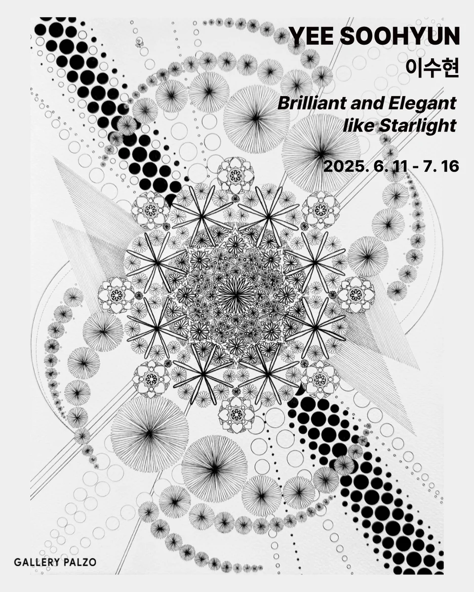 전시 개요 OVERVIEW 이수현 작가는 삶의 소중함과 각기 다른 삶에 대한 애정을 그림을 통해 표현합니다. 불완전한 인간이 사회에 스며들어 그 일원이 되기 위해서는 ‘관계 맺기’가 필연적이라 여긴 작가는, 자신 또한 불완전한 존재임을 자각하며 여러 사람들과 관계를 맺는 과정속에서 환희, 기쁨, 슬픔, 분노 등 희로애락(喜怒哀樂)의 감정을 경험하였고, 이러한 감정들은 점의 크기와 개수로 상징화하기 시작했습니다. 작가는 인간의 불완전함을 자각하면서, 그 시선을 모든 이의 삶의 소중함으로 확장해 나갔고, 작품 속 점들은 일정한 배열(각자의 가치관)을 따르면서도, 작품마다 다른 모양과 크기, 형태(각자의 개성)로 서로 조화를 이루어 하나의 무늬를 형성합니다. 작가는 각기 다른 삶에 대한 애정과 존중을 이 점들 속에 담아냅니다. 2011년부터 2021년까지는 오일과 아크릴을 주재료로 작업해왔으며, 2024년에는 스와로브스키 등의 장식용 보석을 매체로 새로운 시도를 하였습니다. 이 경험을 통해 본질에 대한 갈망을 자각하게 되었고, 의미있는 전환점이 되었습니다. 이번 전시 《별빛처럼 찬란하고 우아한》展에서는 절제된 흑백의 언어로 보이지 않는 감정의 결을 시각화하며, 작가가 자신과 사랑의 본질을 찾아가는 여정을 담아냅니다. 색을 덜어낸 선과 여백 속에는 깊은 사유와 감정이 깃들어 있으며, 종이 위를 유영하는 선들은 감정의 미묘한 결을 섬세하게 드러냅니다. 사랑이라는 보편적 주제를 절제된 흑백 미학으로 풀어낸 이번 전시는, 작가의 섬세한 표현을 통해 감정의 층위를 시각화하고, 관람자에게는 그 흐름을 따라 각자의 내면에 자리한 ‘별빛’을 발견하는 사유의 시간을 제공합니다. Artist Yee Soohyun’s paintings explore the inherent value of life and her profound connection to the varied human experience. The artist believes that for imperfect individuals to truly belong and integrate into society, forming relationships is essential. Recognizing her own imperfections, she has experienced a full spectrum of emotions—joy, sorrow, anger, and pleasure—while connecting with others. These feelings have since become symbolized in her art by the varying sizes and numbers of dots. Acknowledging human imperfection, she expands this awareness to embrace the inherent value of every life. In her artwork, the dots adhere to a specific arrangement (symbolizing individual values) yet display diverse shapes, sizes, and forms (reflecting unique personalities), harmoniously converging to form a unified pattern. Through these very dots, the artist beautifully conveys her love and respect for diverse lives. From 2011 to 2021, She primarily worked with oil and acrylic. In 2024, however, she embarked on a new exploration, incorporating decorative jewels such as Swarovski crystals into her art. This pivotal experience awakened a profound yearning for t