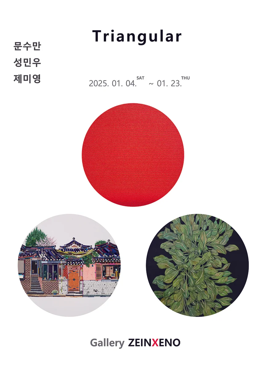 전시 개요 OVERVIEW ‘쌀’을 오브제로 광활하고 심오한 세계관을 구축해나가는 문수만 작가의 클라우드 연작시리즈, 풀을 소재로 생명의 근원과 인간의 윤회적 삶을 은유적으로 표현하고 있는 성민우 작가, 전통 조각보를 만들 듯, 오리고 붙이고 한땀 한땀 바느질을 하는 ‘바느질 콜라주’ 방식으로 자신만의 회화적 표현을 구축한 제미영 작가의 3인전으로 각자의 개성을 마음껏 선보이고 있다. 문수만 작가는 클라우드(cloud) 연작으로 쌀알의 무한반복은 끝없는 수행과정 으로 이어지고 있다. 근본적인 테마는 저변부에 깔려 있는 인간들의 얽혀진 관계와 순환의 세계관인데 ‘쌀알’이라는 독특한 형태소를 유려한 색감으로 표현해 각각의 작품에 색다른 질감과 흐름을 부여하고 있다. 멀리서는 점처럼 보이지만 쌀은 그 자체로 ‘생명’의 의미를 내포한다. 단색의 배경 위에서 동심원, 수평 혹은 수직으로 배열되고 무한으로 이어지면서 정형화하기 어려운 관념들을 표현하고 있다. 현대적 의미로는 컴퓨터 화면에 비트로 쪼개진 데이터가 가득 찬 모습처럼 쌀알 하나하나가 정보를 탑재하고 있음을 시사하기도 한다. 성민우 작가는 고대 그리스어인 오이코스(Oikos)가 작업 세계의 중심이다. 오이코스란 인간의 사적영역 즉 집을 뜻한다. 동양화의 채색과 금분, 은분을 사용해 식물의 미세한 구조, 혹은 이 세상에 존재하는 모든 식물의 생태를 끝까지 추적하고 더 이상 그릴 것이 없는 상태까지 파고들며 세필로 화면을 가득 채워 그린다. 또 생명의 근원적인 존재에 찾아 이 세상에 흩어져 있는 모든 사유와 감성을 통해 우리가 살고 있는 세상의 섭리를 탐구하고 예술적인 시각으로 표현하고 있다. 작가는 1년생 풀들을 소재로 삼은 뒤 실크에 금분과 은분 그리고 동양화 채색 물감으로 펼치는 탱화 기법 등 다양한 전통 한국화 기법은 그의 붓끝에서 매우 현대적인 세련미와 추상미로 완성된다. 제미영 작가는 전통과 현대 건축물이 조화롭게 자리한 골목길을 걸으며 느꼈던 이질적인 조합에서 익숙함과 낯선 감각을 함께 표현하고자 한다. 가까이 들여다보고 싶고, 잠시 머물고 싶고, 소유하고 싶은 바람을 갖게 하는 거리의 풍경들은 작가에게 마법 같은 공간을 구현하게 한다. 걷고, 산책하고, 여행하며 수집된 수많은 이미지들은 색실로 바느질 된 조각보가 되고, 그 조각보들은 다시 색깔띠가 되어 작가의 작업 속에서 선과 면으로 집을 짓게 되는 것이다. 색과 색의 만남은 선과 면으로 이어져 한옥과 벽돌집을 지으며, 골목이 생겨나고 거리가 펼쳐지며, 작가만의 조각 풍경을 완성하게 된다.